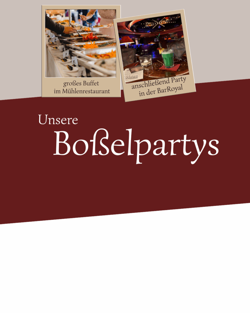Erleben Sie unvergessliche Abende voller Spaß, Musik und guter Stimmung! Unsere abwechslungsreichen Veranstaltungen in der Bar Royal und im Mühlenrestaurant bieten für jeden Geschmack das Richtige – von stimmungsvollen Partys über spannende Spieleabende bis hin zu kulinarischen Highlights. Ob mit Freunden, Familie oder Kollegen – bei uns wird jeder Abend zu einem besonderen Erlebnis.